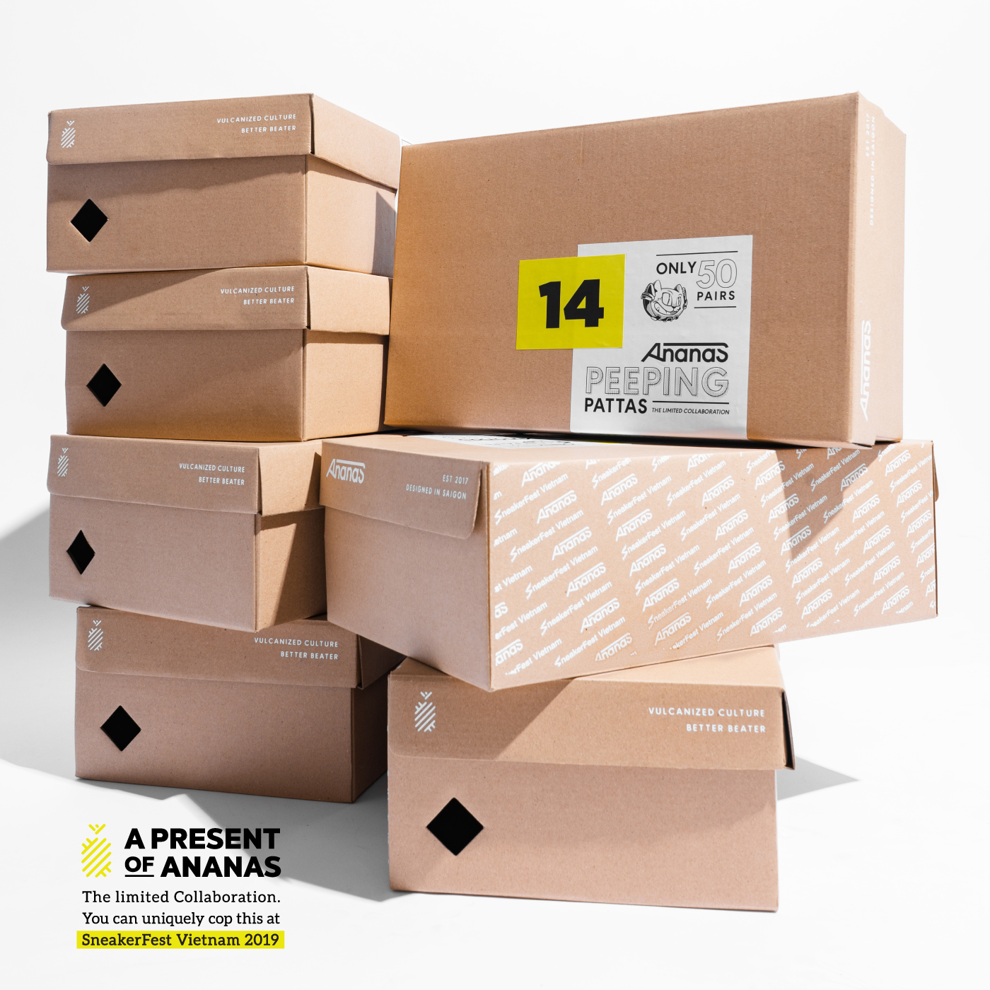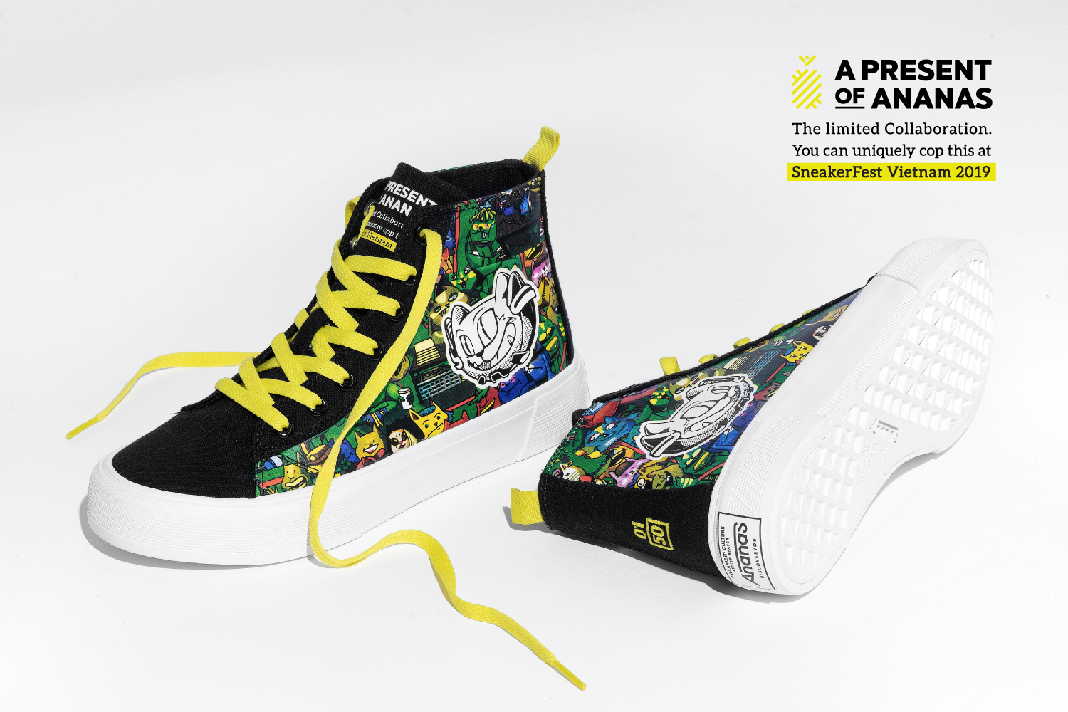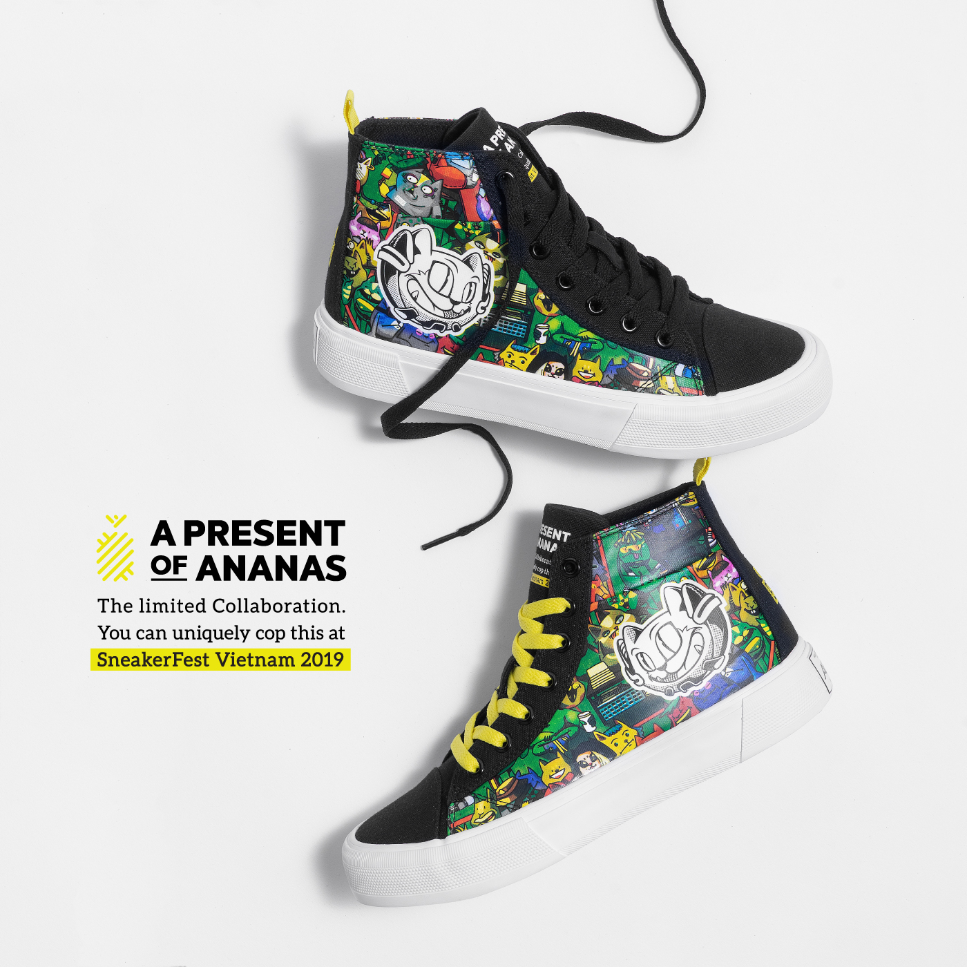 Có mặt tại Sneaker Fest Vietnam 2019, Ananas hân hạnh giới thiệu đến bạn một phát hành mang tên Ananas Peeping Pattas - bản collab giới hạn đặc biệt đánh dấu cho lần đầu hợp tác giữa hai bên. Dáng giày Vulcanized High Top của Ananas được lựa chọn trong thiết kế và cảm hứng bắt nguồn từ linh vật Peeping - đại diện cho tinh thần xuyên suốt 6 năm qua của Sneaker Fest Vietnam, chúng tôi tự tin đây sẽ là sản phẩm đáng mong chờ cho mọi “đầu giày” vào mùa hè 2019 này.