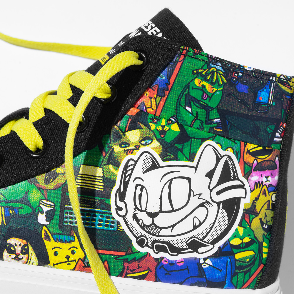 Về tổng thể, bộ đế cao su All white tối giản làm phần nền vững chắc và tạo điểm nhấn cho phần Upper bên trên có phần phức tạp. Chất liệu vải canvas 10oz cao cấp màu Black được sử dụng bao quanh bức tranh đầy màu sắc, trải dài và phủ toàn bộ phần má và cổ giày. Gương mặt Peeping (linh vật quen thuộc của các kì Sneaker Fest VietNam) trở nên nổi bật hơn bao giờ hết khi được sử dụng 2 màu black&white ngay tại trung tâm artwork. Bản collab đem lại cho người nhìn cảm giác về một thế hệ trẻ cá tính, có phần nổi loạn nhưng cũng rất tích cực trong hành trình tìm kiếm và khẳng định bản thân.