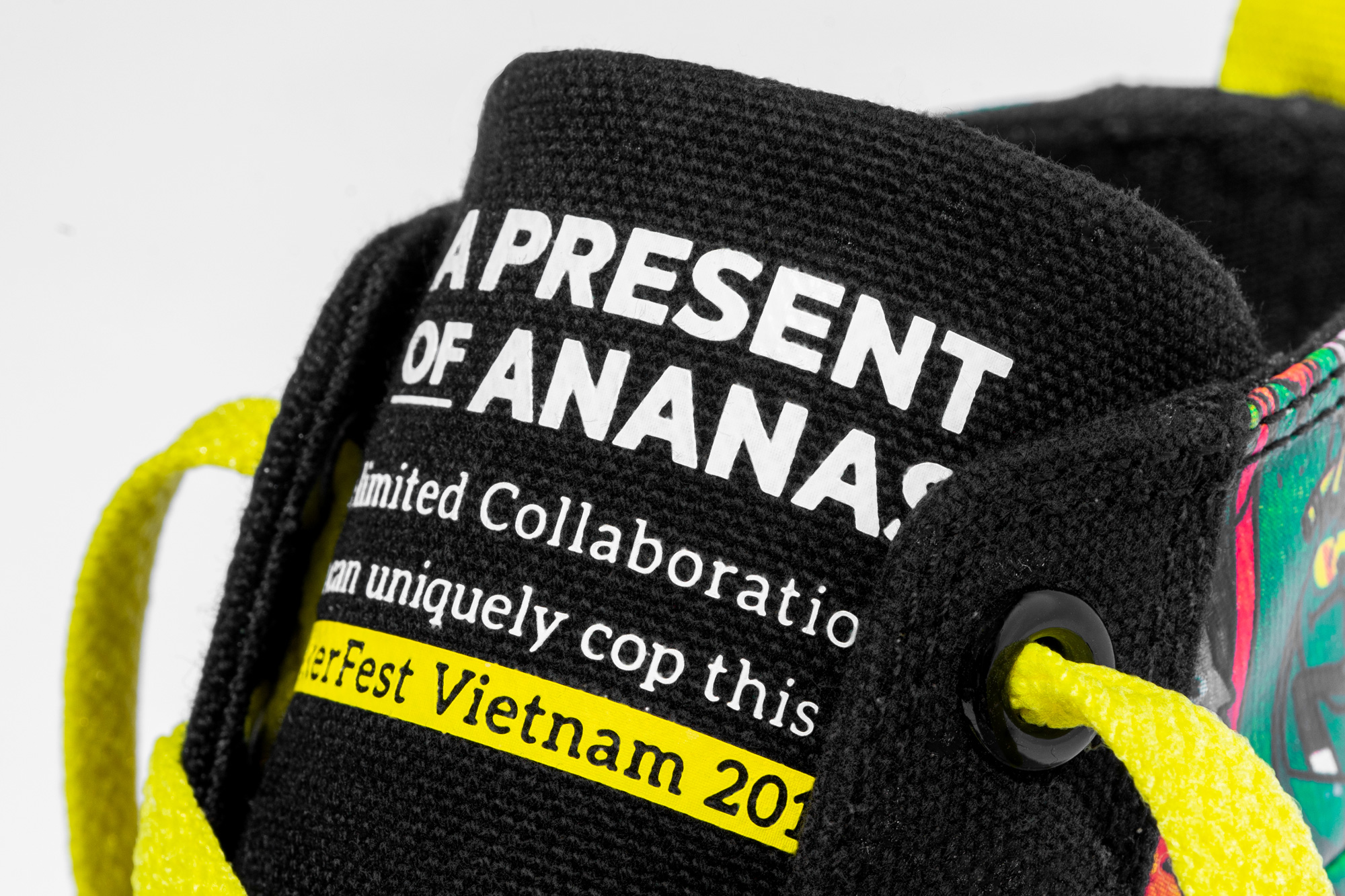 Một điểm đặc biệt của Ananas Peeping Pattas cần phải kể đến là dòng chữ “cộp mác riêng” của bản collab Ananas x Sneaker Fest Vietnam được in 3D trên lưỡi gà mà bạn không thể tìm được ở bất cứ đâu khác. Nội dung in với kích thước vừa vặn cùng điểm nhấn màu vàng bắt mắt đủ tô điểm cho đôi giày thêm ấn tượng và làm tự hào bất cứ ai sở hữu chúng.